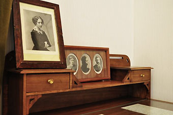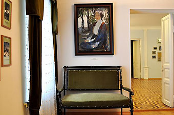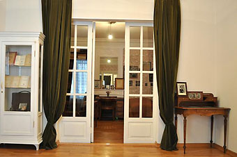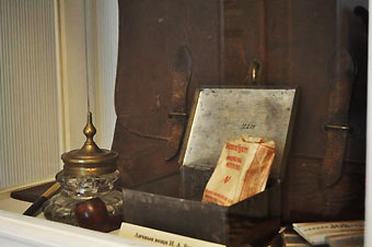 В экспозиции представлены документы из семейного и литературного архива Бунина, портреты и фотографии, рукописи произведений писателя, его ручка, чернильница, мундштук, курительная трубка, табакерка, портфель.